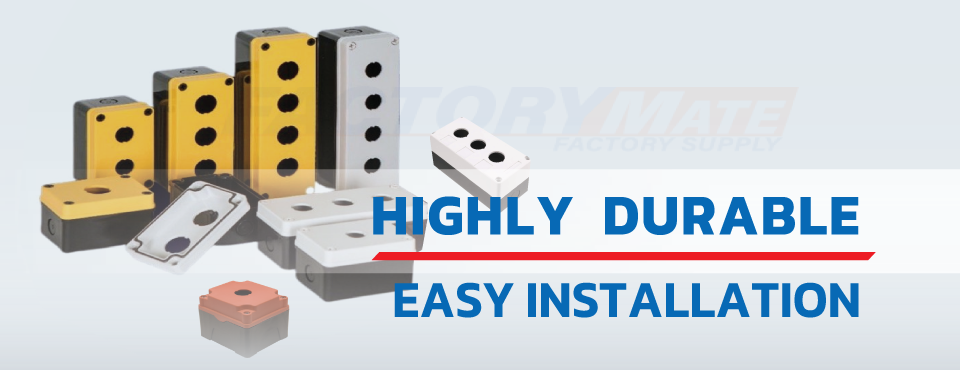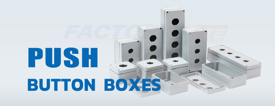PUSH BUTTON BOXES กล่องสวิทช์กันน้ำ กันฝุ่น กล่องใสปุ่มกดสวิทช์ (Switch Box – Push Button Box) เป็นอุปกรณ์หนึ่งที่ใช้ในการติดตั้งภายในโรงงานอุตสาหกรรม ใช้เป็นกล่องคอนโทรล หรือเป็นจุดที่ใช้เป็นสวิทช์ให้กับเครื่องจักร และอุปกรณฺต่างๆซึ่งมีทั้งแบบกล่องอลูมิเนียม และแบบพลาสติก ABS-PC มีความทนทานสามารถใช้งานได้ง่าย กล่องใส่สวิทช์มีตั้งแต่ 1 ช่องจนถึง 4 ช่อง