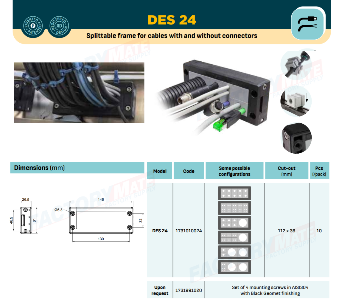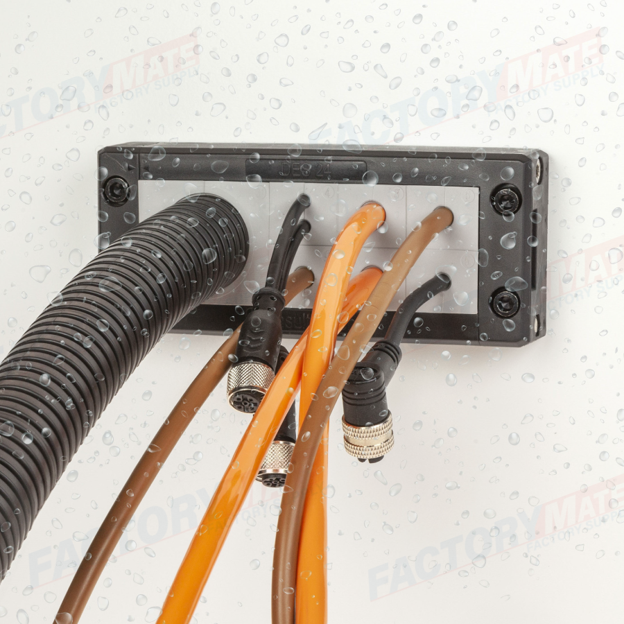 The DES 24 divisible frame allows the routing of cables with or without connectors with diameters from 2 to 35 mm thanks to the various cable grommets available. The side closure of the frame allows strain relief, dust and water protection.