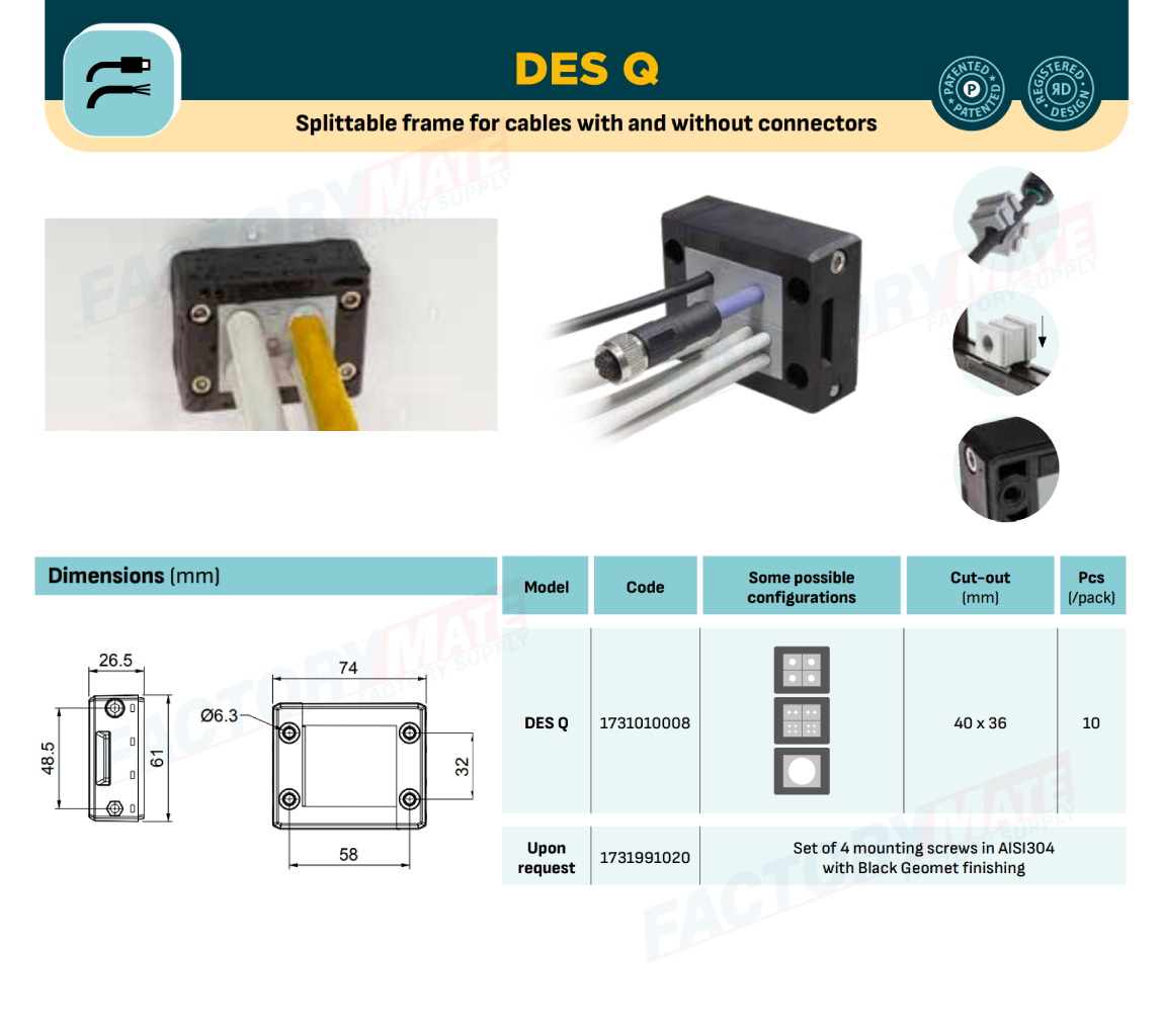 The divisible DES Q frame allows cables with and without connectors to be routed through cabinets and machine panels. Once closed the frame guarantees the strain relief and high IP protection.