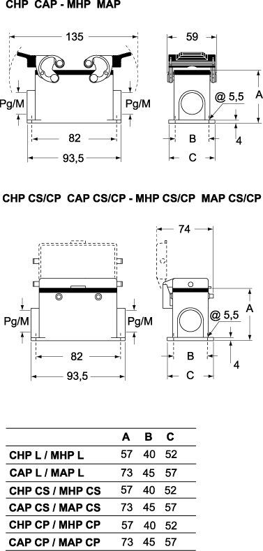 The ILME CHP-10 C-Type surface mount standard housing is size 57.27 and features a double lever with a PG 16 cable entry. The body is epoxy coated die cast aluminum with polyamide handles and stainless steel levers. Insert center distance: 57 x 27 mm. Rated IP 66 when attached and locked down. The clamping force supplied by the CHP-10 is constant due to the stainless steel locking system.