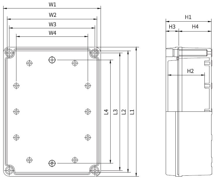 | ABS Transparent cover | Cover (H3) | Base (H4) | Size (W1×L1×H1/mm) | Size (W2xL2xH2/mm) | PG type | P type | |