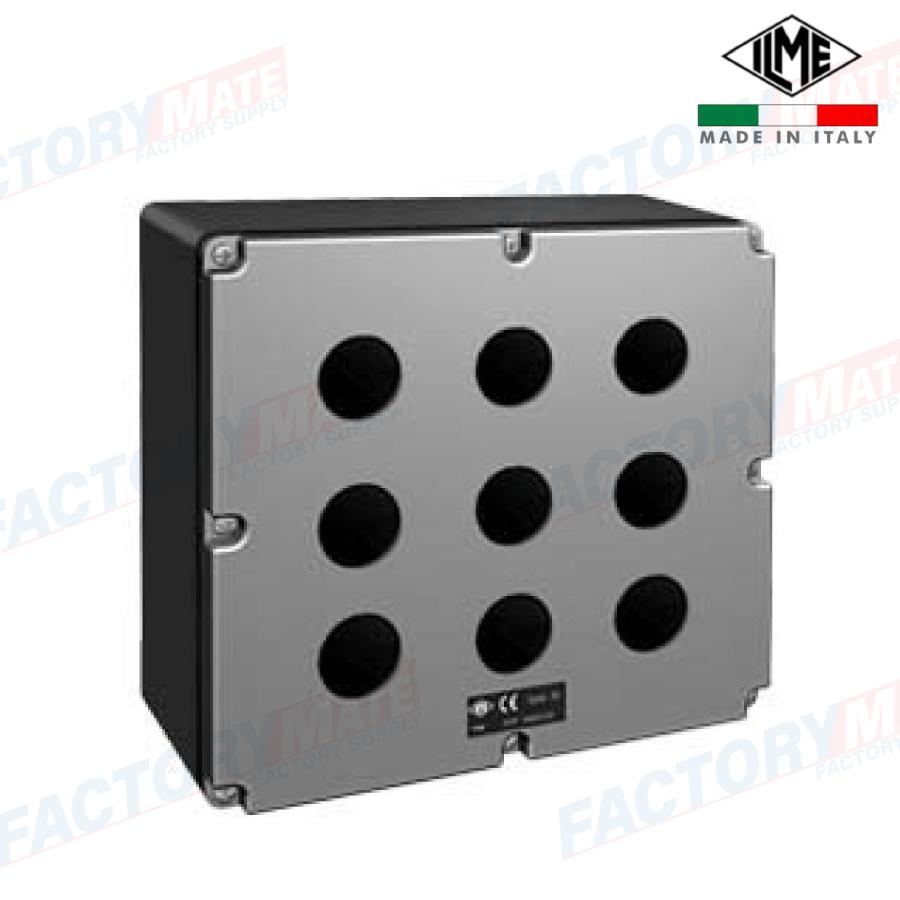 Box for control devices and signals, AC series, Without cable entry, 9 holes for unit Ø 30, External Size 230x205x102 mm.