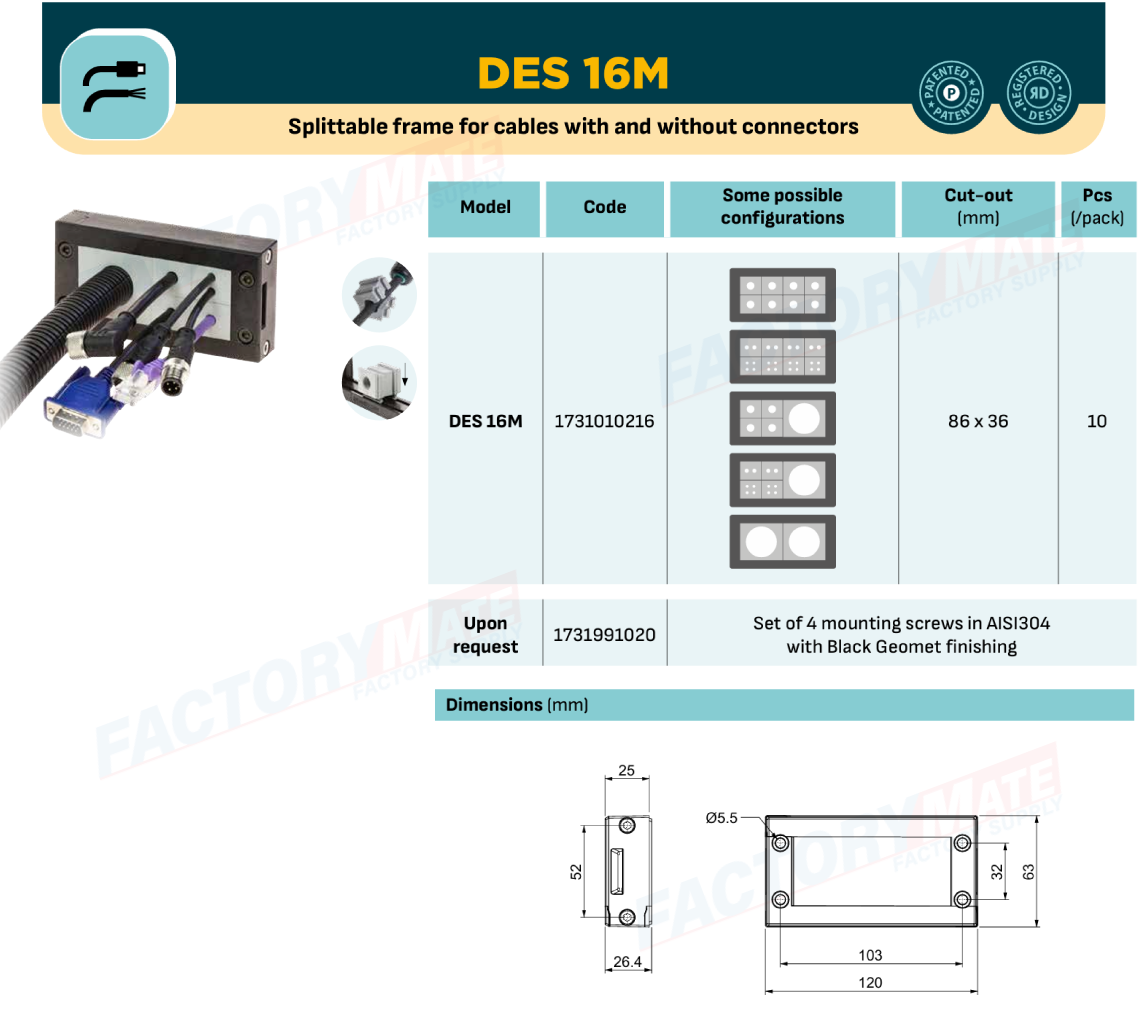 The DES 16M splittable frame allow up to 32 cables with or without connector or one or two cables up to 35mm diameter to pass through electric cabinet or machines walls.