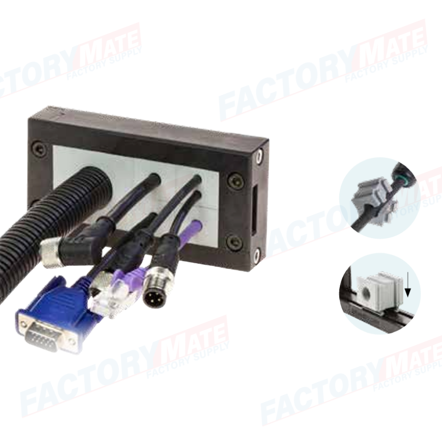 The DES 16M splittable frame allow up to 32 cables with or without connector or one or two cables up to 35mm diameter to pass through electric cabinet or machines walls. The small and big grommets can be freely positioned inside the frame.