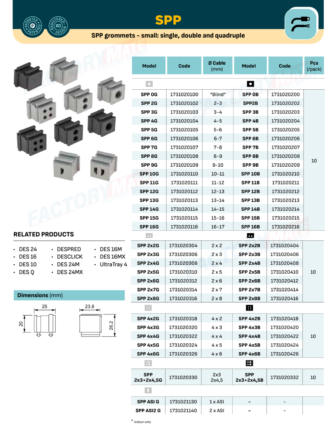 The SPP 2X series cable grommets allow two cables with diameter from 2 to 8 mm to be routed through the DES splitable frames series. Long product and high resistance to industrial oils.