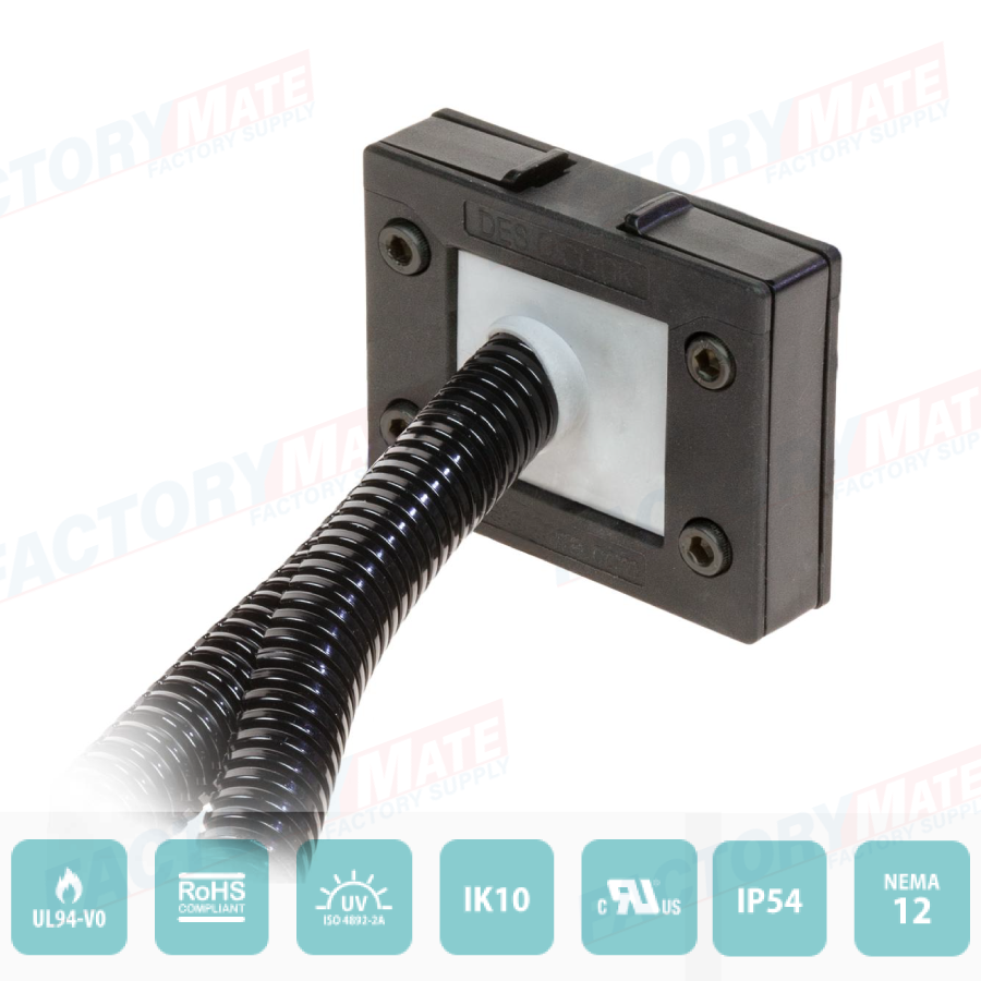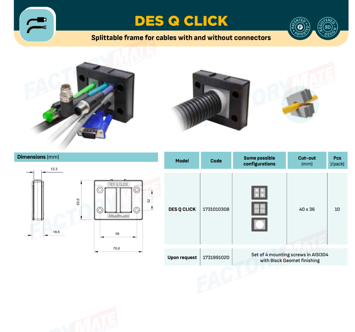 The DES Q CLICK frame allows allows the routing of up to 16 cables with and without connectors, with diameters from 2 to 31 mm, thanks to the various grommets available.