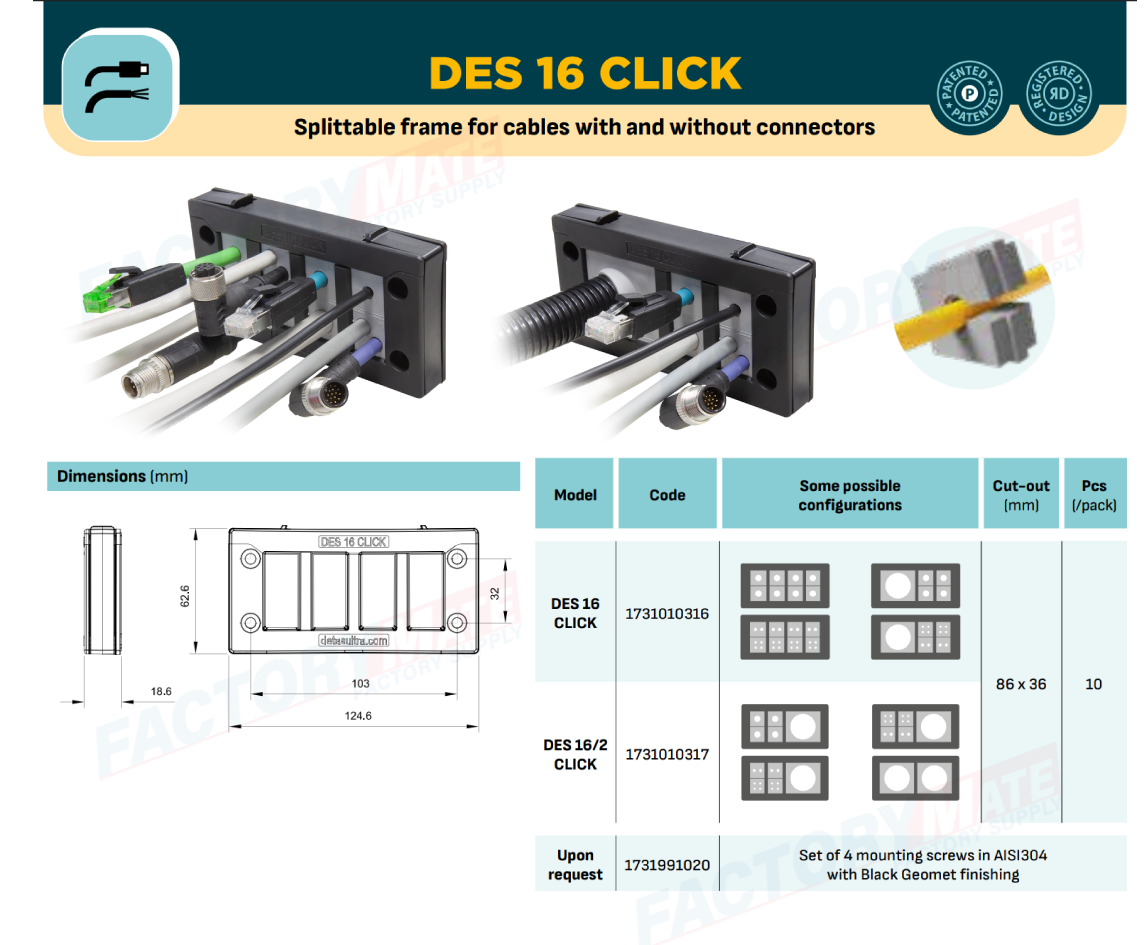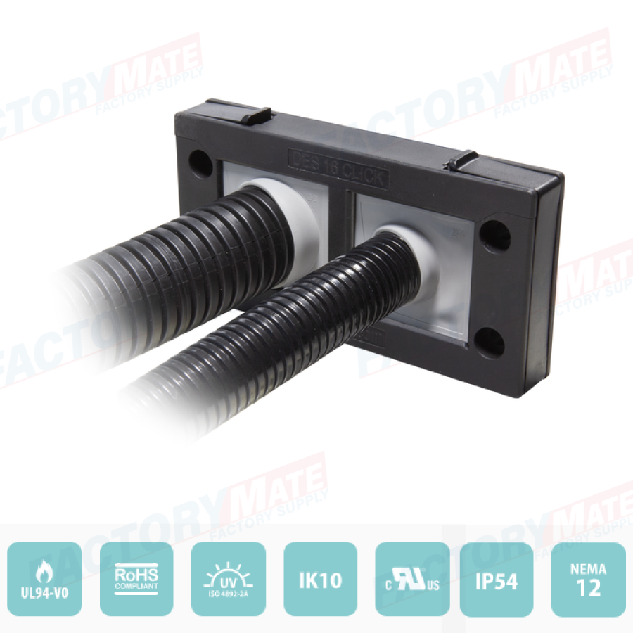 The DES 16 CLICK frame allows allows the routing of up to 32 cables with and without connectors, with diameters from 2 to 31 mm, thanks to the various grommets available.