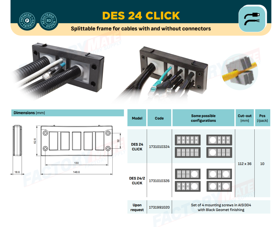 The DES 24 CLICK frame allows the routing of up to 40 cables with and without connectors, with diameters from 2 to 31 mm, thanks to the various grommets available.