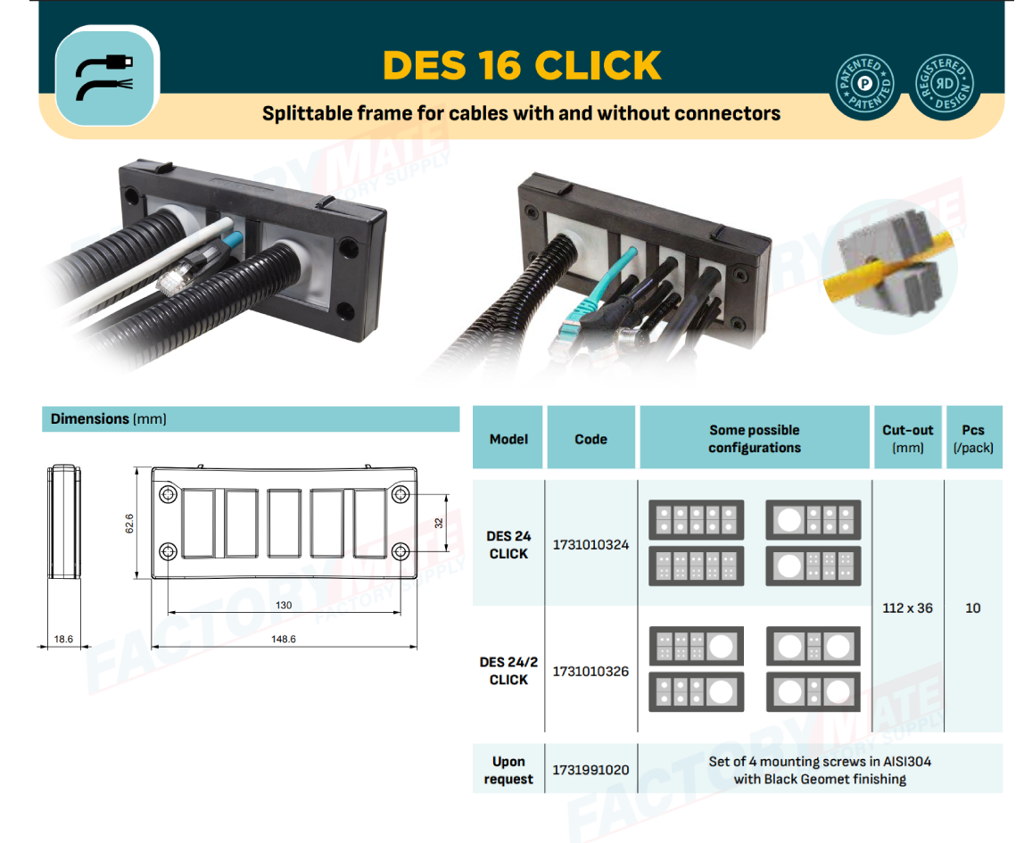 The DES 24 CLICK frame allows the routing of up to 40 cables with and without connectors, with diameters from 2 to 31 mm, thanks to the various grommets available.