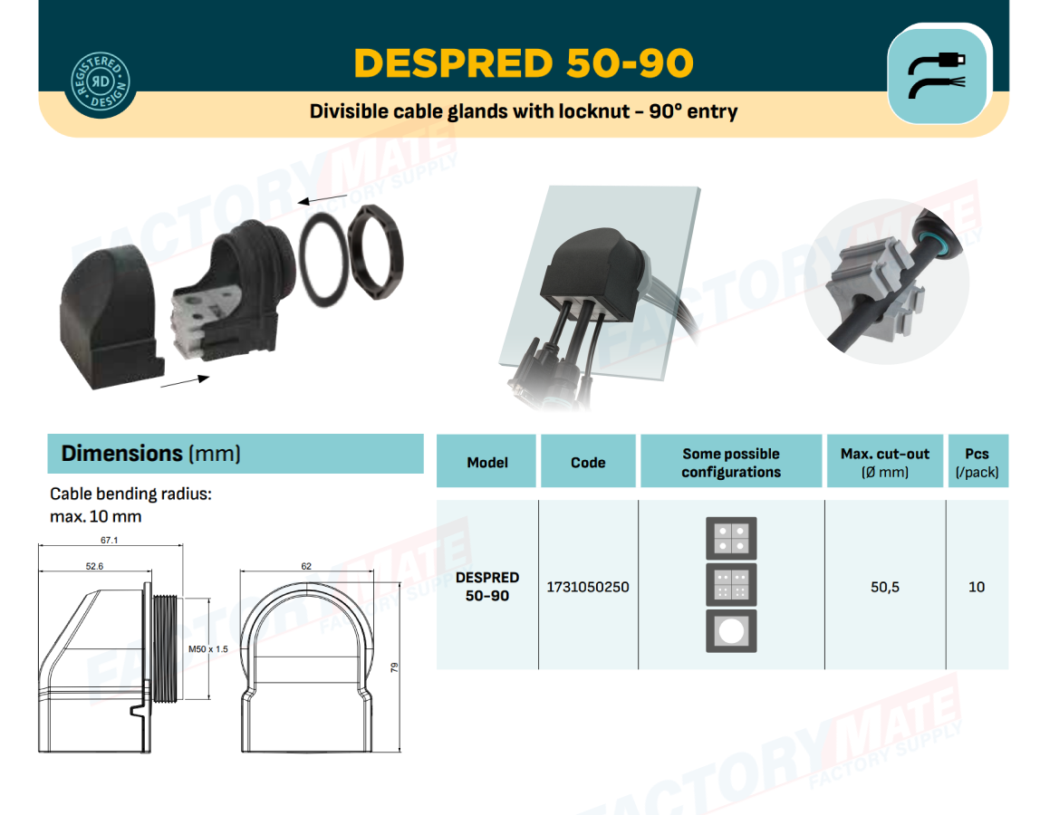 Divisible cable gland with metric threads with 90° entry. DESPRED 50 90 can be equipped with small, multiple and large grommets.