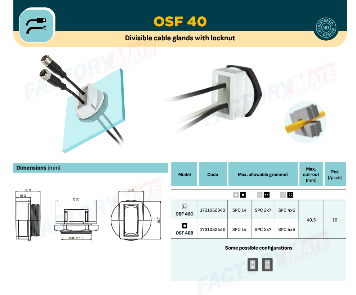 OSF 40 is a divisible cable gland with metric threads particularly suitable for use with cables with connectors.