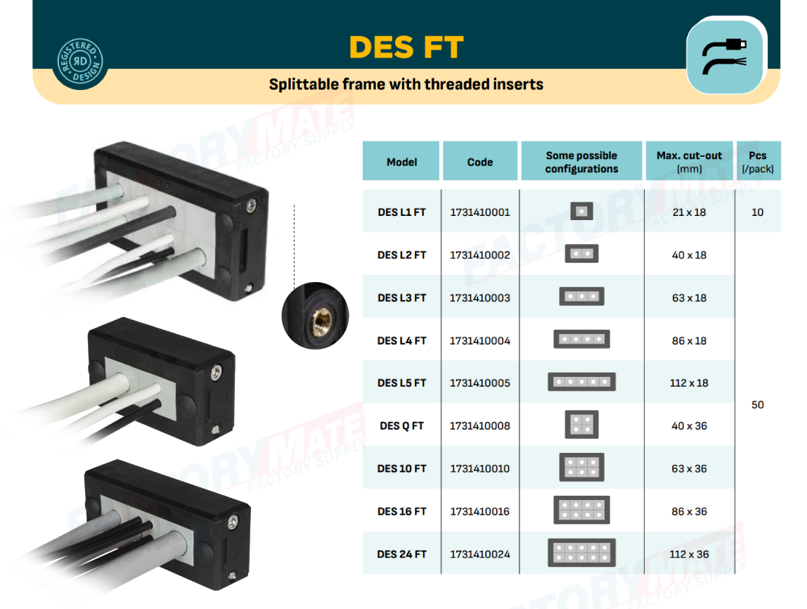 The divisible frames of**the DES FT**series allow the**routing terminated and non-terminated cables**with diameters from 2 to 35 mm thanks to the various grommets.