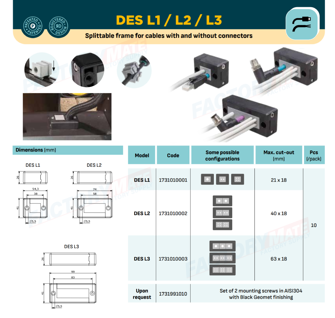 The DES L1 allows cables with connectors to pass through cabinets. Once assembled, the system guarantees the cable strain relief and high IP protection.